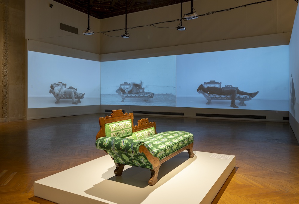 In 2022, Chan’s project, Patterns, invited the public to examine America’s intergenerational privilege and culture of gaslighting when confronting racial and social inequities. Chan decolonized an 1890s fainting couch and transformed it into a touchable art and conversation piece. She posed an important question: who gets to be fragile and who has to be strong? To create the associated video installation, Chan filmed Mills College students fainting on the couch, and provided a series of prompts to answer anonymously, which were compiled into a slideshow.