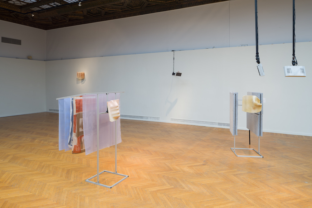 In related sculptures, they used high-frequency directional speakers to reflect sound into hand-made ceramic diffuser tiles. Gork chose ceramic tile, felt, and fabric to complicate the sonic experience in unexpected ways.
