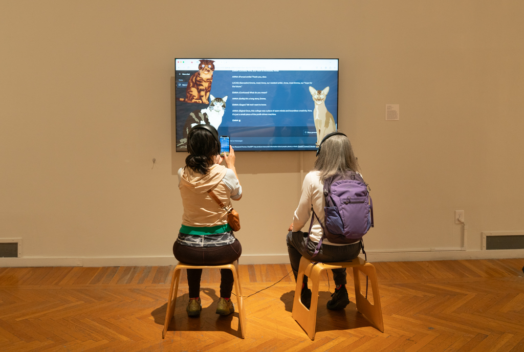 The video script was written by ChatGPT, released in December 2022, and reveals many biases about art, education, race, privilege, and technology. Characters in the video are portrayed by animated by cats—an early icon of the internet. The work culminated with a song performance that the artist commissioned a gig actor from Fiverr.com to produce, using the lyrics written by ChatGPT.