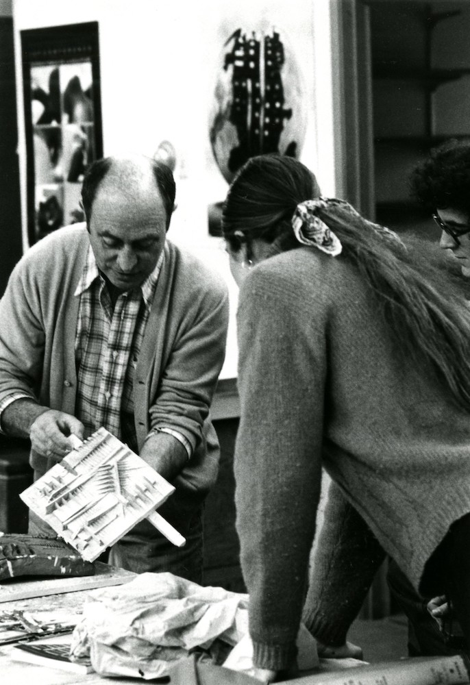 From 1979-1982, internationally renowned Italian sculptor Arnaldo Pomodoro (1926-2025) was in residence as the Mary Woods Bennet Distinguished Visiting Professor, teaching graduate and beginner courses in sculpture. Known for his geometric bronze works, Pomodoro’s sculptures often contain tears or stalagmite-like aberrations, and appear worm-eaten and corroded, giving the illusion of being caught in the process of gradually transforming into another object altogether.