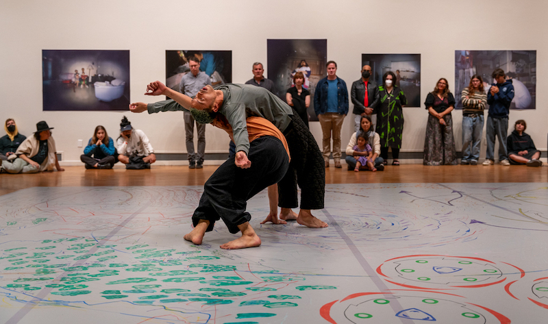 Mukherjee’s large drawing atop a dance floor mapped an imaginary forest and mine to explore territories that have both universal mythical significance and site-specific ecological and cultural significance. Created as an invitation to all visitors to physically explore and perform, This is a map of a mine in a forest/This is a drawing/This is a dance floor/This is a question/This is an invitation, honored the rich history of cross-fertilization between the performing and visual arts at Mills College.
