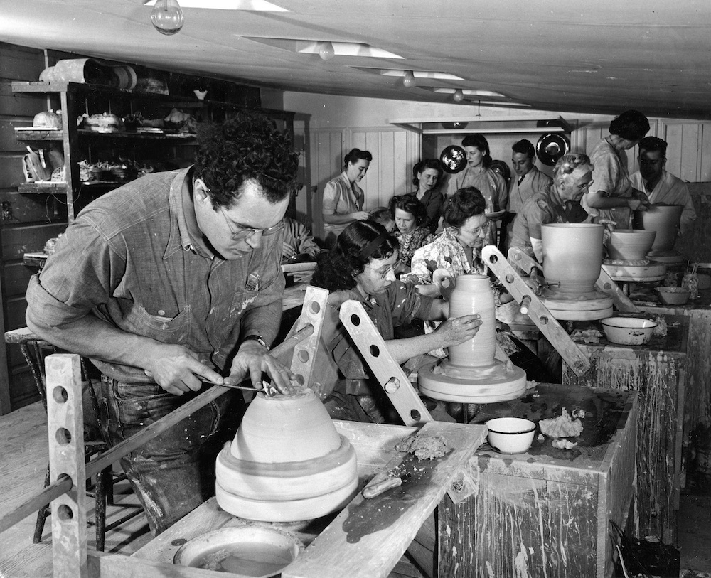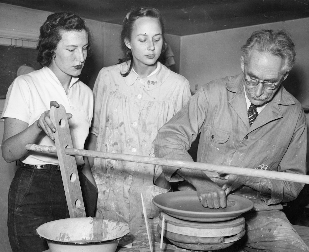 The Guild was established by a group of students who were enrolled in the summer pottery program at the College but wanted to be able to work year-round. They proposed a deal: in exchange for studio time and space, they would upgrade and maintain the shop facilities without interrupting the work of Mills students. Carlton Ball, Professor of Ceramics and chairman of the art department, agreed to the arrangement and became an honorary member of the Guild. Among the original Guild members were Elena Netherby, Helen Mitchell, Ruby O’Burke, Nancy Alexander, Esther and Fenner Fuller, and Antonio Prieto, a group of both established and emerging Bay Area artists interested in modernist ideas. Conceptually, the Guild paralleled the emergence of cooperative potteries on the East Coast in the 1920s and 1930s. Like the Mills College Ceramic Guild, these potteries were founded and operated mostly by women, produced popular decorative wares, and were committed to the advancement of technical skills and research in the ceramic arts. This surge in “art pottery” served as a foundation for the American modern ceramic movement.
