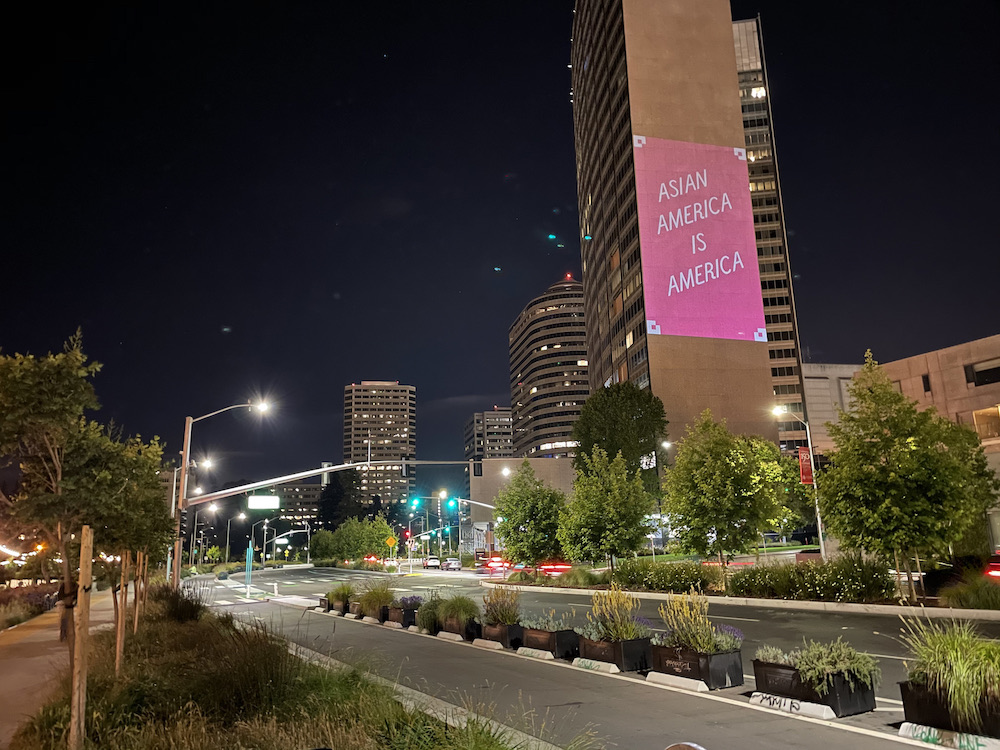 A film director and visual artist, Chan uses storytelling and community organizing to create dialogue around race, class, and social justice issues. The 4 to 15-story tall projections beamed images and messages of resilience in English and eight different Asian languages, including, among others, Chinese, Taiwanese, Japanese, and Thai. With a few exceptions, the projections were unsanctioned and intentionally installed without gaining permission from municipalities and local corporations. Dear America was an artist-run project supported by community donations and community partners such as the Mills College Art Museum, the non-profit organization Stand With Asian Americans, and the Chinese Historical Society of America in San Francisco.