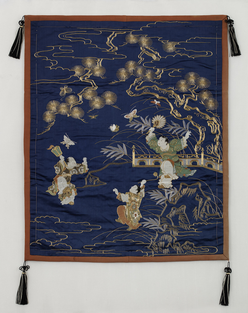 One of the finest examples in the collection depicts Chinese children chasing butterflies. The interest in Chinese philosophy and poetry reached its peak in Japan in the mid 1700s, when this fukusa was created. These karako, literally Chinese children, were used much in the same manner as Western artists used the image of the cherub. Chasing butterflies symbolizes the attainment of manhood, and this fukusa would have been given as a gift at The Thirteenth Year Ceremony. The six butterflies on this fukusa likely refer to a court dance, Kocho no Mai, which was performed by six young women costumed as butterflies. The large amount of gold-wrapped thread on the fukusa is visual evidence of the affluence of the giver, and the extremely fine embroidery used in the patterning of the costumes depicted in this scene is among the finest in the collection.