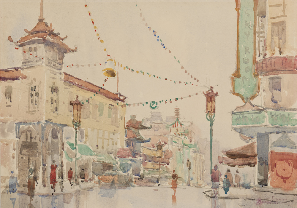 In addition to holdings from a large range of Asian cultures and time periods, the museum’s collection and exhibition history has included a focus on local Asian American artists from the very beginning. Early examples include the work of Dong Kingman, a Chinese American artist and a leading watercolorist. Born in Oakland in 1911, he avidly documented San Francisco’s Chinatown in the early 20th-century with images characterized by bold color and broad brushstrokes. He is known for his urban paintings and was one of the few known Asian American artists to work in the 1930s for the Works Progress Administration during the Great Depression, examples of which are in the museum’s collection.