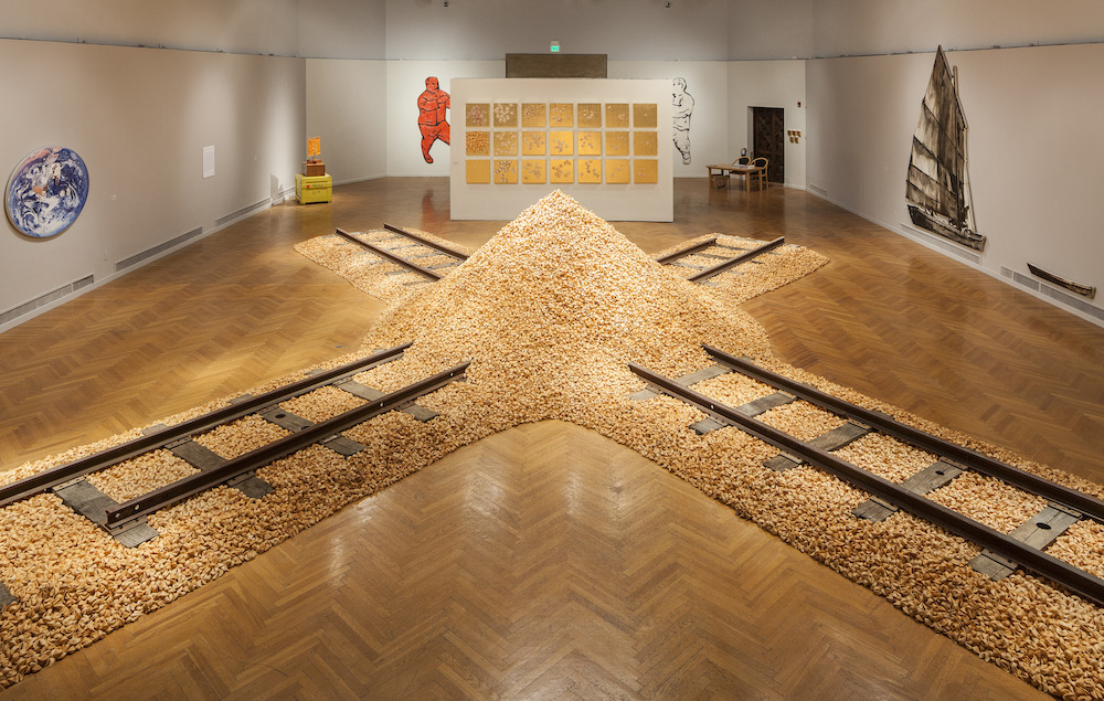 More recently, the museum’s exhibitions have continued to showcase narratives focused on Asian American experiences in the Bay Area. The 2013 exhibition Hung Liu: Offerings featured the work of Chinese-born painter Hung Liu, a long-time painting faculty member at Mills College known for championing the stories of often marginalized migrant communities. The museum recreated her monumental installation Jiu Jin Shan (Old Gold Mountain), in which Liu used over two hundred thousand fortune cookies to create a symbolic gold mountain that engulfs a crossroads of railroad tracks running beneath. The junction where the tracks meet is a visual metaphor for the cultural intersection of East and West as well as for the end of dreams of many Chinese immigrants who perished during the building of the transcontinental railroad in the United States.