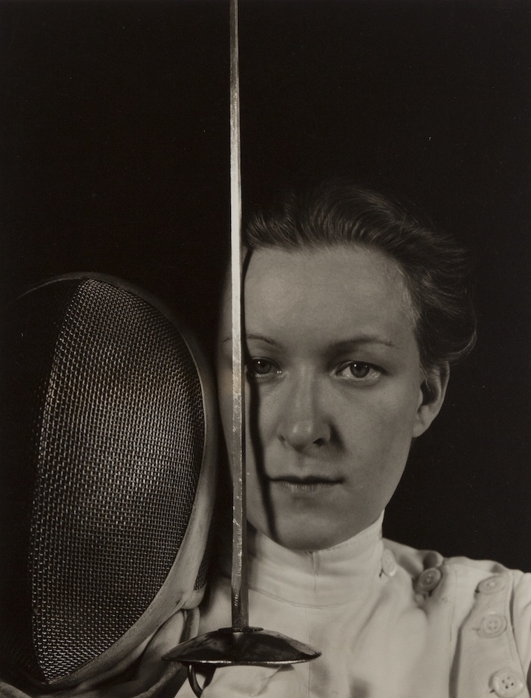 Cunningham’s portrait of Olympic fencing champion Helene Mayer is exemplary of the formal techniques embraced by Group f/64 photographers. Mayer taught fencing and German at Mills and was one of two Jewish athletes invited to compete for the German team in the 1936 Summer Olympics in Berlin during the Nazi regime. Cunningham’s portrait uses dramatic lighting and a tight composition to amplify the power and determination of her sitter. The directness of Mayer’s gaze is reinforced by the glint of light illuminating the straight edge of her fencing blade, creating an image of beauty and strength.