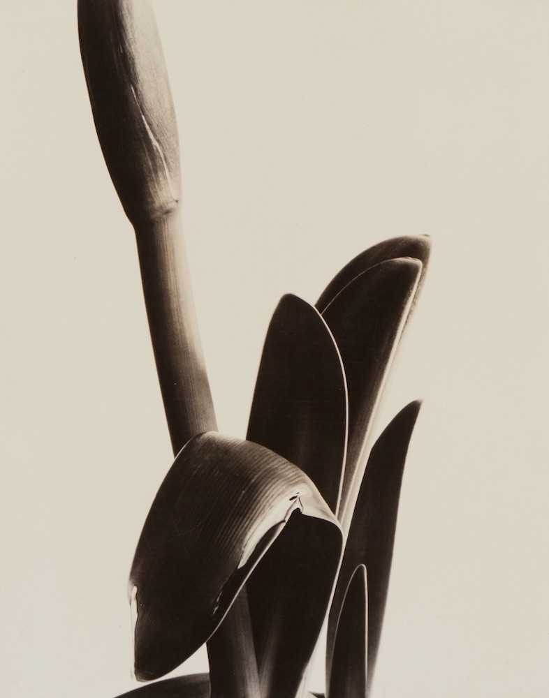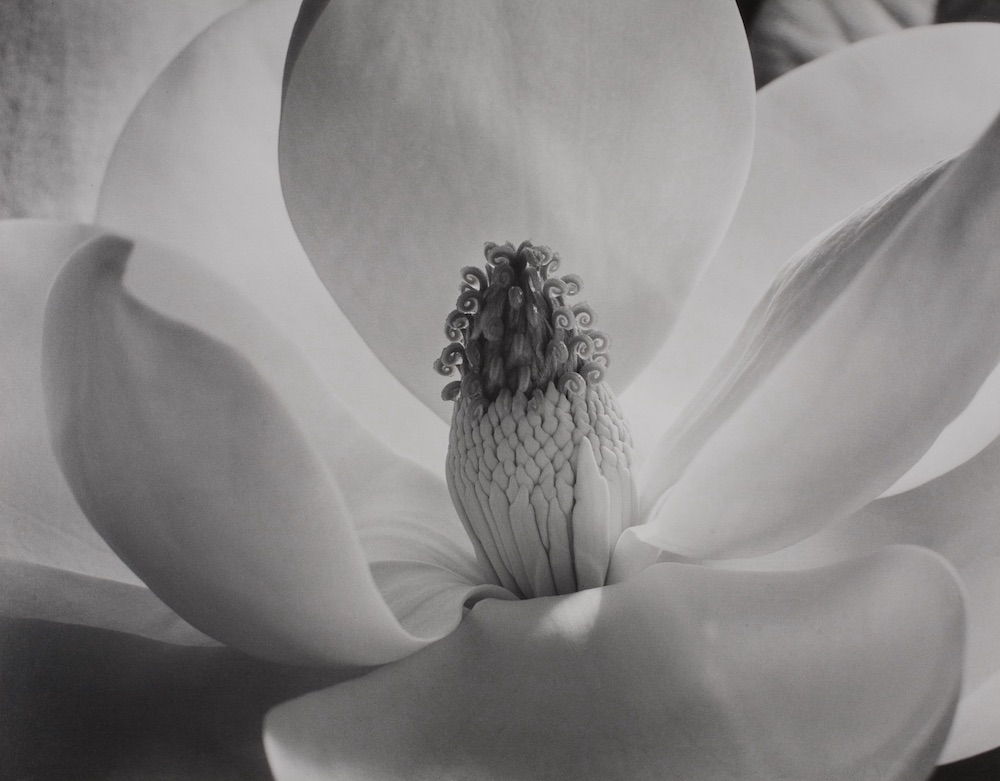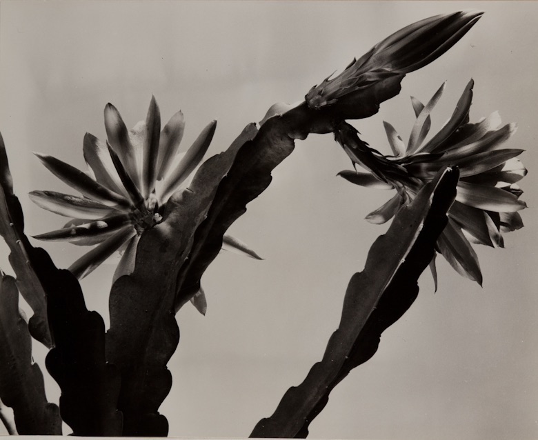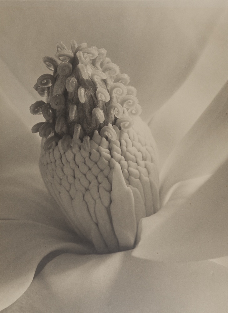 Amaryllis is an elegant example of Cunningham’s interest in botanical subjects. As a faculty wife with three young children, the flowers and plants in her backyard garden became one of her early primary subjects. These dynamic images were captured at a time when she needed distraction from her domestic life and mark an important phase in her work. Her closely cropped botanical images demonstrate a fiercely contained creative energy and honed sensitivity to patterns in nature. Magnolia Blossom: Tower of Jewels is perhaps Cunningham’s most well-known botanical image. The closely cropped flower fills the entire frame. The pistils and stamens are in sharp focus and the petals become a transfixing study of light, shadow, and translucence. It is an unsentimental and, for its time, entirely novel approach to familiar and easily romanticized subject matter.